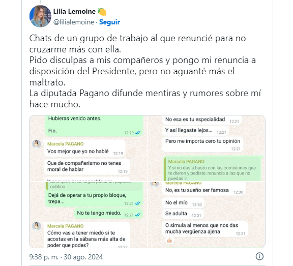 Para sumar validez a su testimonio, Lemoine compartió capturas de pantalla de una discusión que tuvieron en el grupo de WhatsApp, algo que parece volverse costumbre en el oficialismo, luego de lo sucedido con la diputada Arrieta. En su tweet, la ex asesora de imágen aseguró: "Pido disculpas a mis compañeros y pongo mi renuncia a disposición del Presidente, pero no aguanté más el maltrato. La diputada Pagano difunde mentiras y rumores sobre mí hace mucho".