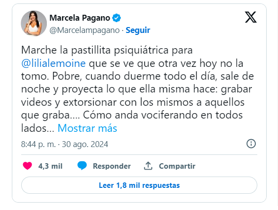 “Marche la pastillita psiquiátrica para @lilialemoine que se ve que otra vez hoy no la tomó. Pobre, cuando duerme todo el día, sale de noche y proyecta lo que ella misma hace: grabar videos y extorsionar con los mismos a aquellos que graba", acusó Pagano.