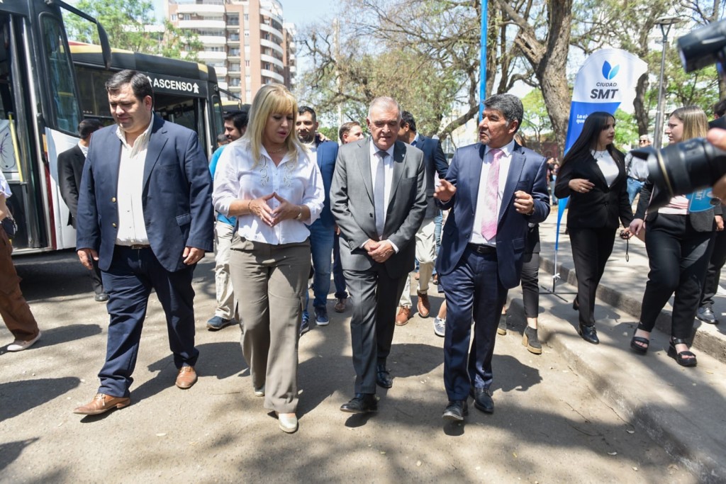 En el Parque Avellaneda, el vicegobernador Miguel Acevedo, el gobernador Osvaldo Jaldo y la intendenta Rossana Chahla presentaron 10 unidades de ómnibus de la línea 11 y 19, a cargo de TCM Bus SRL, representada por Maximiliano y Guillermo Villagra