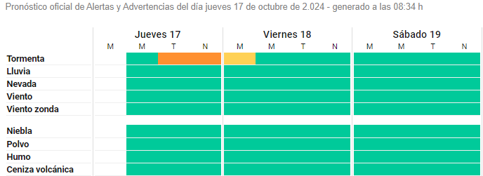 El meteorólogo y observador del SMN, Cristofer Brito informó que la alerta rige desde las 12 h del jueves 17 hasta las 12 h del viernes 18 de octubre. Y explicó en sus redes que "el Servicio Meteorológico Nacional emitió un alerta naranja por tormentas fuertes para toda la provincia de Tucumán. En el periodo comprendido del alerta pueden esperarse tormentas que dejen importantes acumulados de lluvia cortos períodos de tiempo, posible caída de granizo en las tormentas más intensas, ráfagas fuertes de viento y fuerte actividad eléctrica".