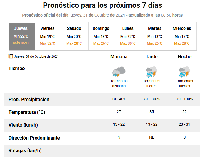 El área será afectada por tormentas, algunas localmente fuertes o severas. Las mismas estarán acompañadas por fuerte actividad eléctrica, ocasional caída de granizo, ráfagas intensas y, principalmente, abundante caída de agua en cortos períodos. Se prevén valores de precipitación acumulada entre 50 y 70 mm, pudiendo ser superados en forma puntual.