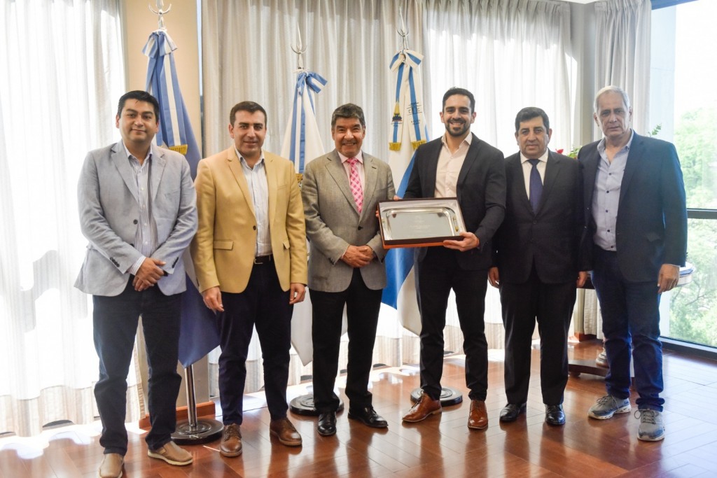 Previo a la disertación “Hacia un Hub Minero Sostenible”, el vicegobernador a cargo del Poder Ejecutivo, Miguel Acevedo, hizo entrega de una bandeja a directivos de la Fundación Federalismo y Libertad por promover los valores de una sociedad libre y democrática.