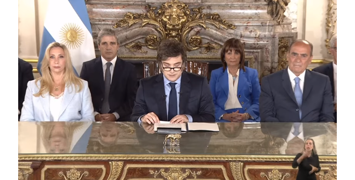 Con motivo de haber cumplido su primer año de gobierno, el Presidente brindó una cadena nacional que duró 37 minutos. Estuvo rodeado por su gabinete y flanqueado por su hermana -de blanco y con gesto impertérrito- Karina Milei, la secretaria general de Presidencia, que tuvo un agradecimiento destacado en el epílogo de su ponencia.