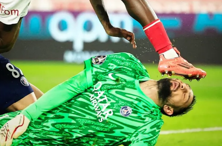El arquero de PSG, Donnarumma recibió un tremendo planchazo en la cara