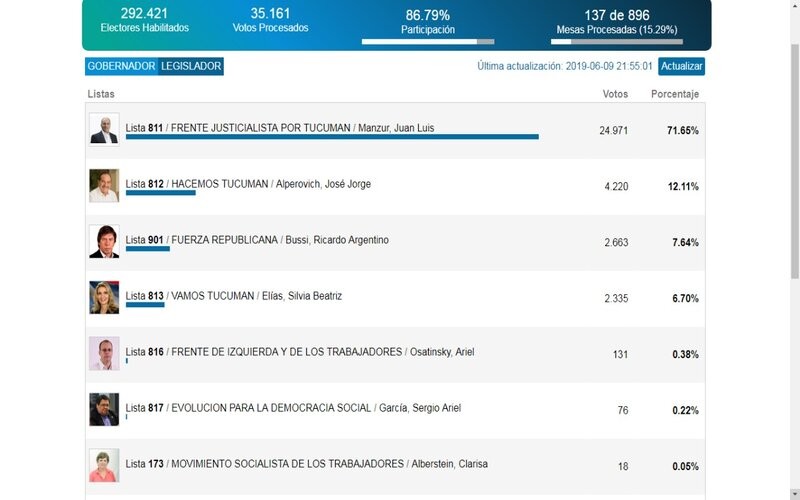 Encabeza el listado Juan Manzur con un 71%. Le sigue José Alperovich con un 11% y Ricardo Bussi con 7,56%. En cuarto puesto encontramos a Vamos Tucumán de la mano de Silvia Elías Pérez con 6,70% y el resto de los postulados no superan el 1%. Cabe destacar que la capital tucumana todavía no apareció en este conteo.