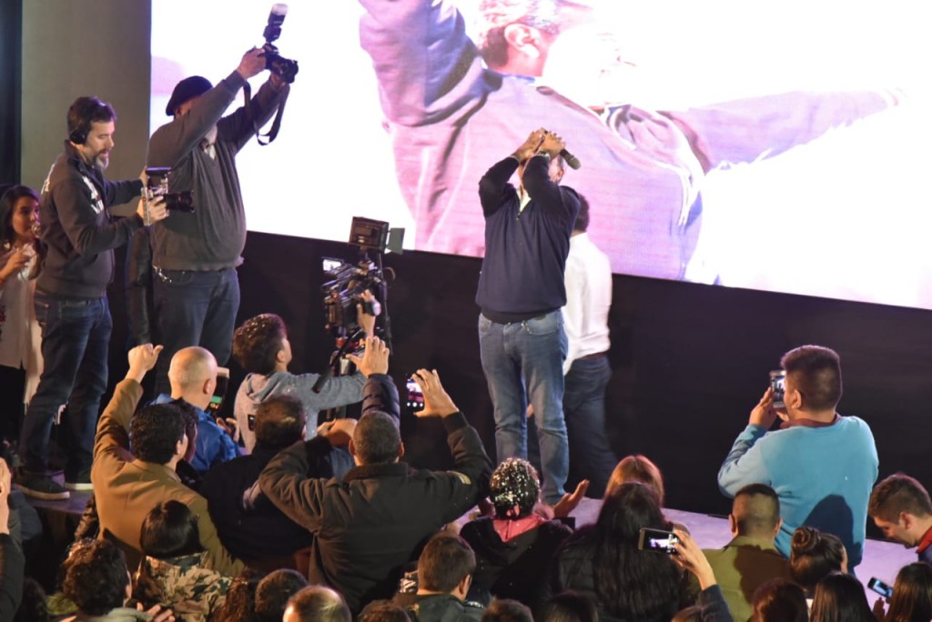 Un vez que pisó el centro de la escena, Alfaro, levantó sus brazos, se arrodilló y más tarde dijo: “¡Me siento honrado porque los vecinos nuevamente me han reelegido como su intendente!”.