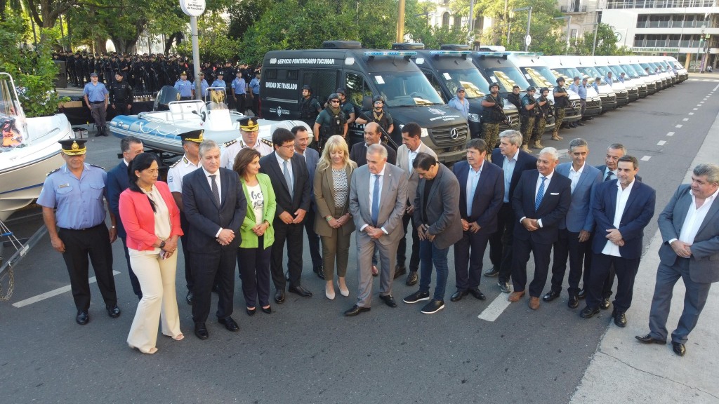 El gobernador Osvaldo Jaldo presidió en plaza Independencia el acto central donde se entregó equipamientos y vehículos a la Policía de Tucumán y al Servicio Penitenciario provincial.