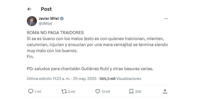 Luego el Tedeum en la Catedral Metropolitana, el presidente Javier Milei publicó un fuerte mensaje desde sus redes sociales contra el jefe de Gobierno de la Ciudad de Buenos Aires, Jorge Macri, donde lo calificó de "traidor". En la ceremonia, el mandatario había esquivado el saludo al alcalde porteño y no cruzó palabras con la vicepresidenta Victoria Villarruel, en una clara muestra de la tensión que se vive en Casa Rosada.