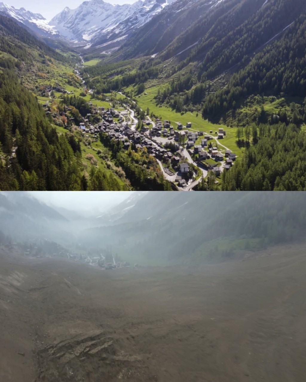 El deslizamiento, de una violencia devastadora, arrasó el 90 % del casco urbano e implicó el desprendimiento de unos 3,5 millones de metros cúbicos de material que descendió la ladera a una gran velocidad, bloqueando además el curso del río Lonza, según informaciones transmitidas desde el lugar por la televisión pública suiza RTS.