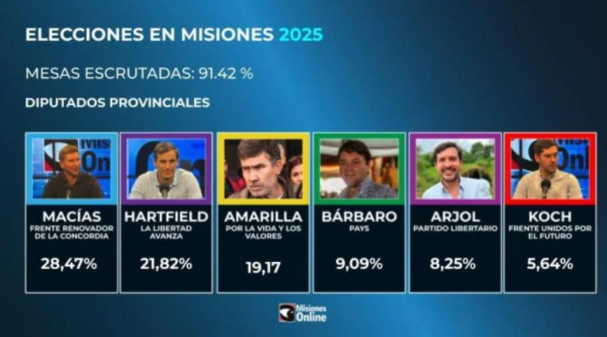 Escrutado el 98,9% de los votos, el oficialismo misionero, con Sebastián Macías encabezando la lista, se impuso en la votación a diputados provinciales, sumando el 28,6% de los sufragios.