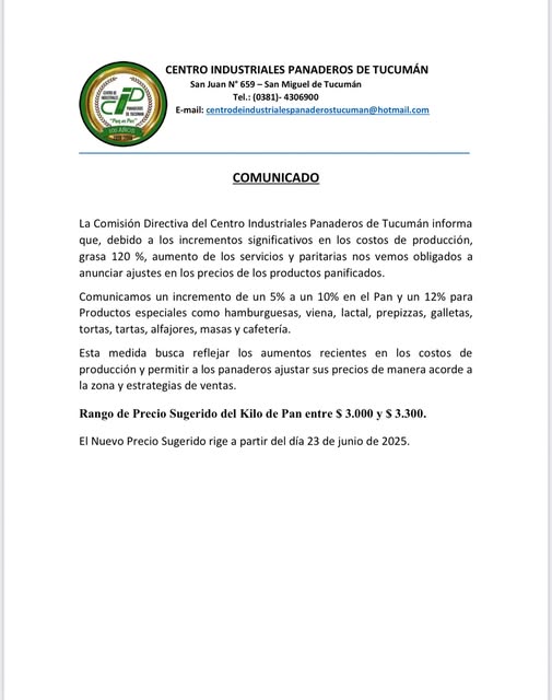 La Comisión Directiva del Centro Industriales Panaderos de Tucumán, notificó que desde el 23 de junio el precio del kilo de pan aumentará, y pasará a costar entre $ 3.000 y $ 3.300.