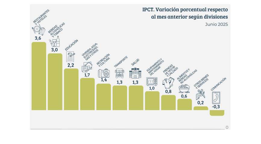 Las dos divisiones que registraron las menores variaciones en junio de 2025 fueron Alimentos y bebidas no alcohólicas (0,6%) y Prendas de vestir y calzado (0,5%).