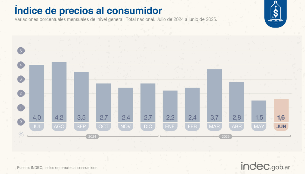 El Índice de Precios al Consumidor (IPC) de junio fue de 1,6% y acumuló un total de 39,4% en comparación con el mismo mes del año pasado, según informó el Instituto Nacional de Estadísticas y Censos (INDEC). En lo que va del año, acumuló un alza de 15,1%.