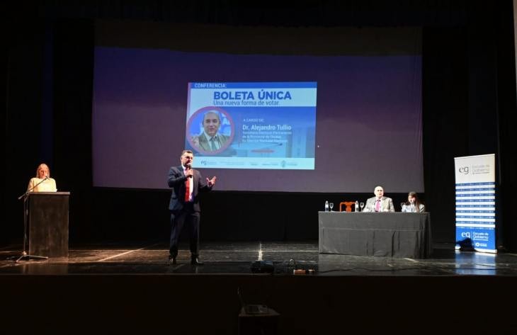 En el Teatro San Martín de la Capital una conferencia sobre el nuevo sistema de votación con Boleta Única, que comenzará a implementarse el próximo 26 de octubre. El evento, organizado por la Escuela de Gobierno, estuvo a cargo de Alejandro Tulio, secretario electoral permanente de la provincia de Chubut y exdirector nacional electoral.