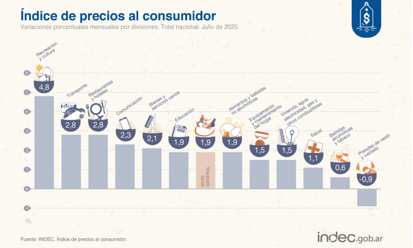 La variación interanual (julio 2025 comparado con julio 2024) del nivel general es de 36,3%. La mayor variación para este período se observa en la categoría “Educación” (112,2%) seguida por “Vivienda, agua, electricidad, gas y otros combustibles” (80,1%).