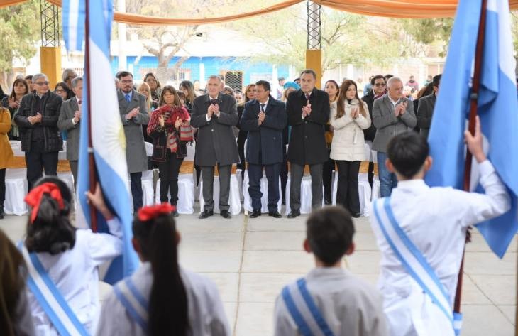 El gobernador Osvaldo Jaldo visitó la mañana la Escuela N° 10 Claudia Vélez de Cano de Amaicha del Valle para dejar inaugurado el patio techado, una obra que permitirá a los alumnos y docentes disfrutar de actividades en el establecimiento durante todo el año.