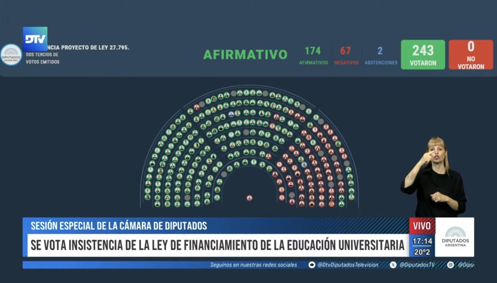 Minutos después, se trató el veto a la Ley de Financiamiento para las Universidades Nacionales. En este caso, el resultado fue de 174 votos a favor de rechazar el veto y 67 en contra. Al finalizar la votación, los diputados de los bloques opositores se levantaron de sus bancas y entonaron cánticos en defensa de la universidad pública.