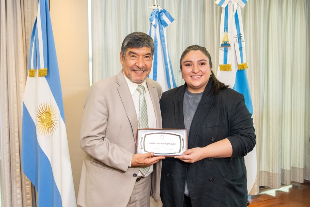 El vicegobernador a cargo del Poder Ejecutivo, Miguel Acevedo, distinguió a la artista tucumana Eugenia Rodríguez por su sobresaliente participación en el programa televisivo La Voz Argentina, donde llegó a la final del certamen. El reconocimiento sirvió para destacar su talento y celebrar el orgullo que genera su música al representar la identidad provincial en un escenario nacional.