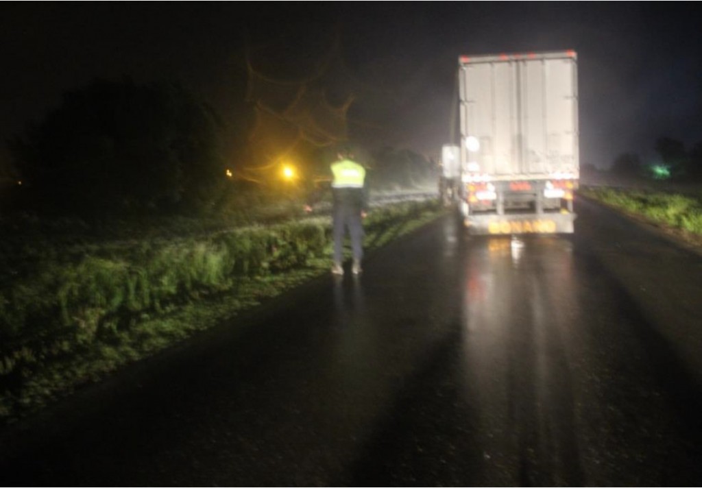 Luego, el vehículo de carga fue sobrepasado por otro rodado de color oscuro (marca Peugeot) que lo obligó a volver a detenerse siendo abordado por cuatro individuos vestidos con chalecos de policía. Uno de ellos subió por la escalera del lado del conductor con un arma de fuego tipo pistola. Al tener la ventanilla bajada trató de abrir la puerta pero se trabó en un forcejeo con el camionero.