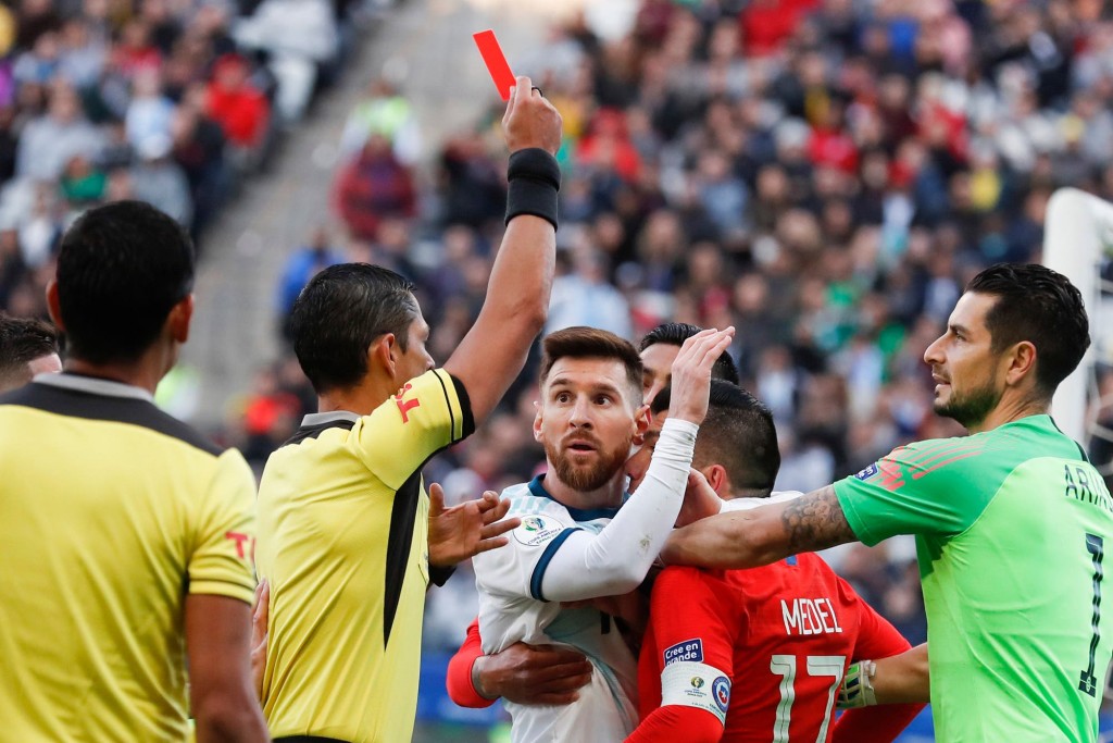 El Tribunal de Disciplina de la Conmebol resolvió sancionar a Lionel Messi con una partido de suspensión y una multa de 1.500 dólares por la expulsión en el partido por el tercer puesto de la Copa América entre Argentina y Chile. En aquella ocasión, el árbitro paraguayo Mario Díaz de Vivar decidió mostrarle la tarjeta roja tanto al astro rosarino como al defensor Gary Medel por un encontronazo entre ambos, que debió ser resuelto con un acrílico amarillo para cada uno.