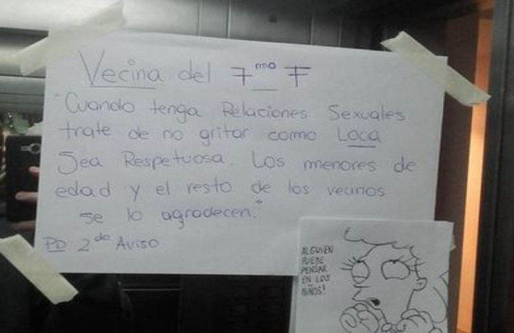 El cartel que estaba pegado en el espejo del ascensor decía: “Vecina del 7ºF: cuando tenga relaciones sexuales trate de no gritar como una loca. Sea respetuosa. Los menores de edad y el resto de los vecinos se lo agradecerán. PD: Segundo aviso”.