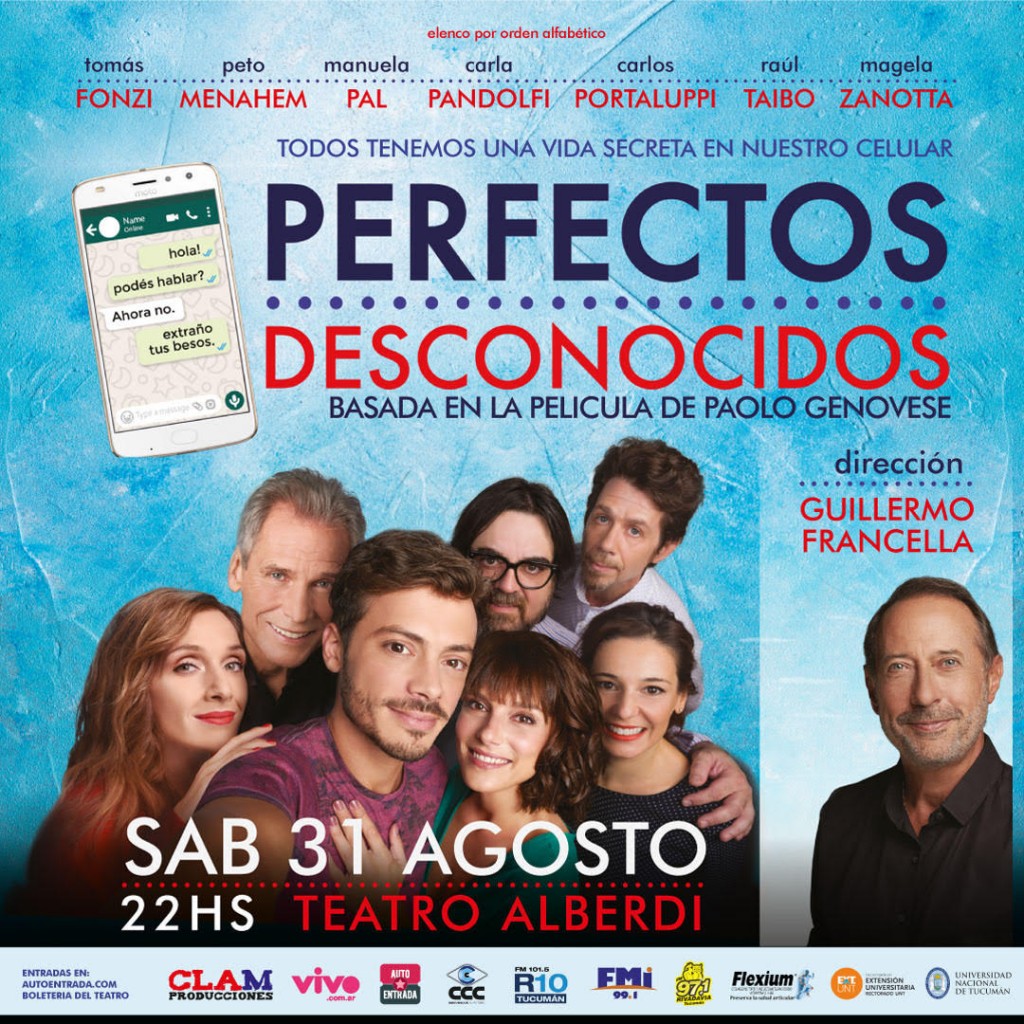 Tomás Fonzi, Peto Menahem, Manuela Pal, Carla Pandolfi, Carlos Portaluppi, Raúl Taibo y Magela Zanotta, son los protagonistas de esta historia de amigos de años y sus parejas que, en una noche de tantas que se reúnen a cenar, la dueña de casa propone un juego: que cada uno deje su celular sobre la mesa y todo mensaje o llamada que llegue, sea leído o escuchado por todos, para probar que nadie tiene nada que ocultar. Desde ese momento se abre una caja de Pandora, con sorpresas y giros que alternan entre el drama y la comedia, para descubrir que en realidad eran... perfectos desconocidos.