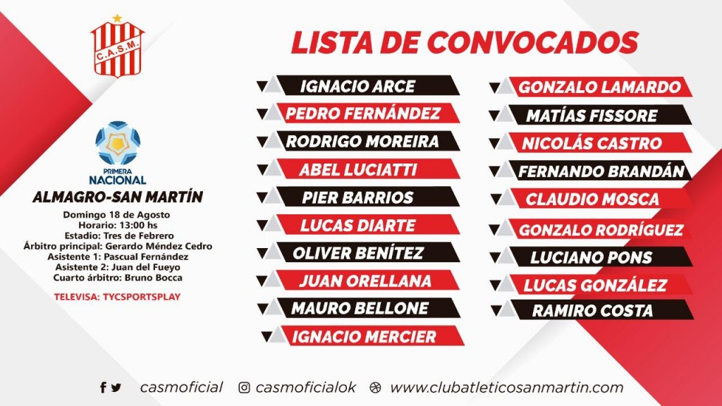 En San Martín cuentan las horas para el debut oficial del equipo en la Primera Nacional, que se concretará el domingo, ante Almagro. Esta mañana se confirmó la lista de jugadores que formarán parte de la delegación, que partirá mañana a Buenos Aires. La novedad está en la ausencia de Luis Aguiar, uno de los últimos refuerzos del equipo.