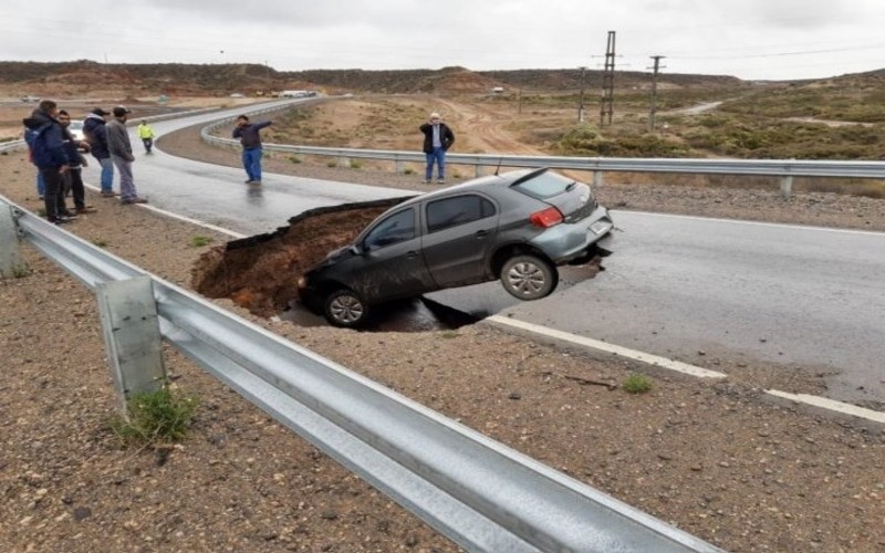 Se trata de un auto, VW Gol, que se hundió en un profundo bache provocado al socavarse el terreno. Afortunadamente los dos hombres que viajaban en el vehículo no sufrieron heridas de consideración.