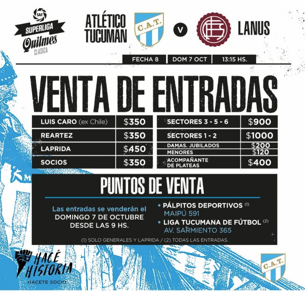 Los hinchan podrán adquirir los tickets, desde las 9 de la mañana y hasta el inicio del partido, en la Liga Tucumana de Fútbol (Sarmiento 365) y Pálpitos Deportivos (Maipú 591).