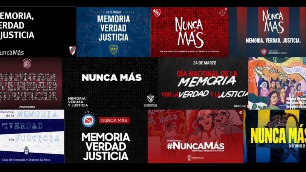 Los otros clubes grandes también se sumaron: "No olvidamos porque un pueblo sin memoria es un pueblo sin futuro. #NuncaMas. #MemoriaVerdadYJusticia", fue el tuit de Racing Club; "Memoria. Verdad. Justicia. Hoy. Y siempre", el de San Lorenzo; y "Hoy seguimos diciendo #NuncaMás, con el compromiso de fortalecer nuestra memoria colectiva", el de Independiente. Boca acompañó con un flyer alusivo a la fecha y el hashtag#MemoriaVerdadJusticia y River recordó: "Reafirmamos nuestro compromiso para seguir construyendo un país con Memoria, Verdad y Justicia. #NuncaMás".
