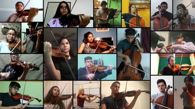No es en vivo ni está hecho en simultáneo porque los retrasos y las dilaciones que podrían provocar la más mínima falla en la conexión a internet echarían a perder todo el esfuerzo. Desde sus casas, en plena cuarentena obligatoria por la pandemia de coronavirus y con ayuda de un metrónomo que reemplaza la presencia del director, cada uno ejecuta su pieza. A través de un fino trabajo de edición, cada fragmento se superpone al otro y el resultado es una muestra cabal del talento y el sacrificio del ensamble juvenil.