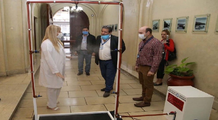 Rossana Chahla, ministra de Salud, calificó como creativa a la aplicación de este equipo, que se suma a las medidas que se implementan para la desinfección de manera simple y rápida: “La idea es poder emplear una sustancia desinfectante compuesta de un 70 por ciento de alcohol y 30 por ciento de agua. Además contamos con una base de hipoclorito de sodio para la desinfección de los calzados”, comentó.