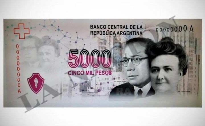 El billete que ilustra esta nota es la copia de uno de los primeros diseños del billete de $5000 (no el definitivo). En el frente están Ramón Carrillo y Cecilia Grierson. En el anverso, el instituto Malbrán.