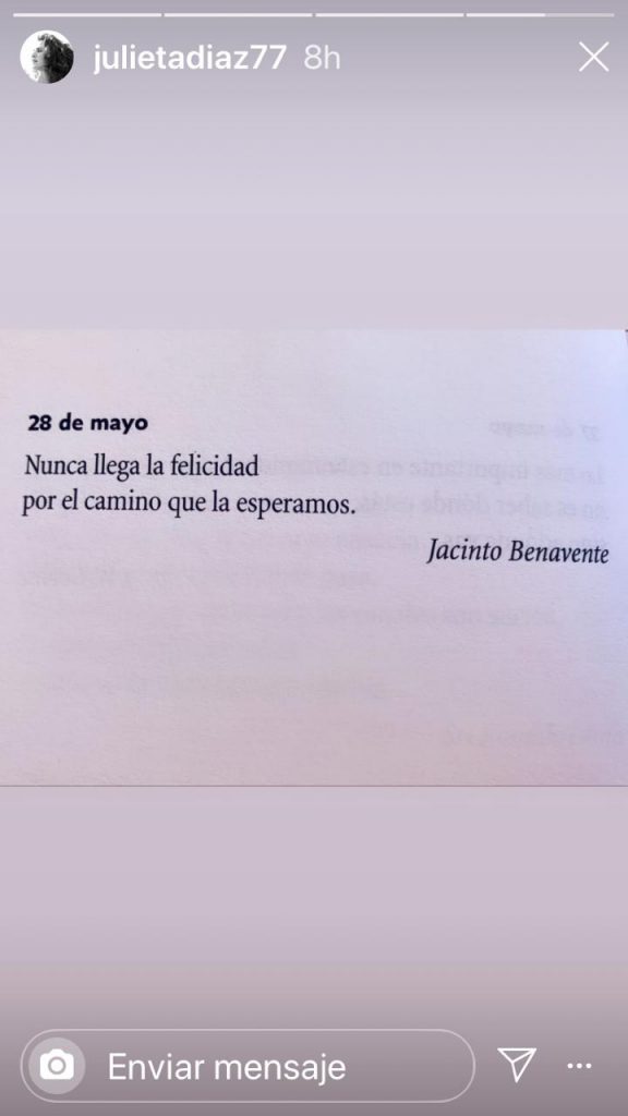 “28 de mayo. Nunca llega la felicidad por el camino que esperamos”, es el texto que publicó la artista en sus Instagram Stories. La cita pertenece a Jacinto Benavente, un dramaturgo, escritor y guionista de cine español.